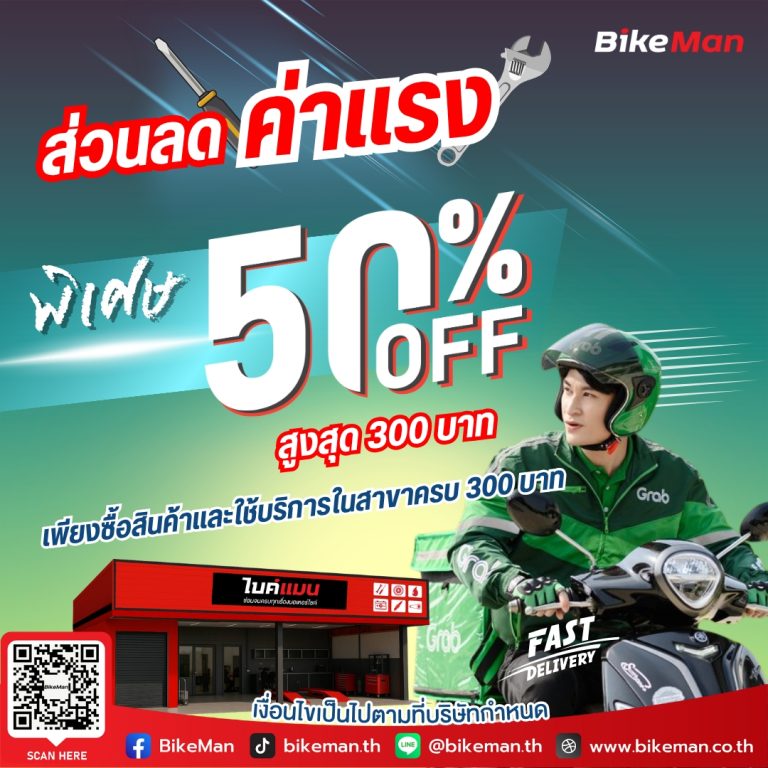 รับส่วนลดค่าแรงสูงสุด 50% ทุกระดับไรเดอร์ เมื่อซื้อสินค้า และบริการภายในร้าน